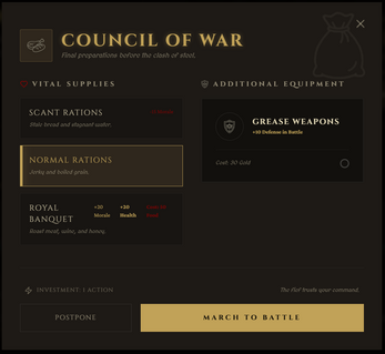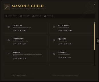 - Base Building: Develop your fiefdom on a 4x4 grid. Upgrade buildings up to Tier 3 to survive. Build a Granary to ration food, a Tavern to attract veteran sellswords, or a Forge to repair decaying equipment.