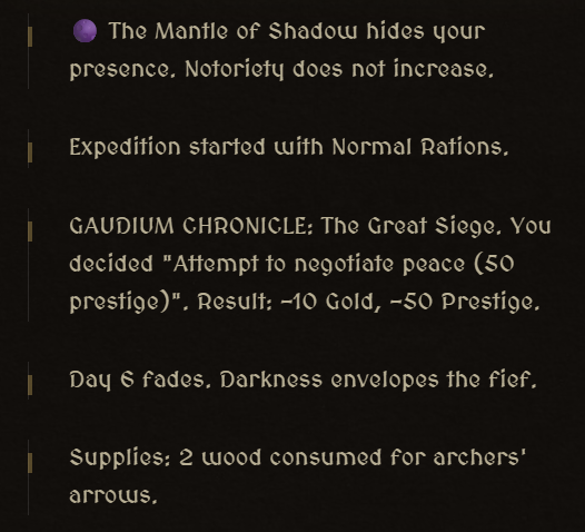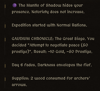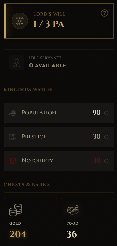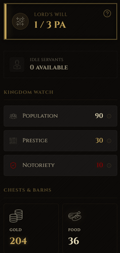 - Unforgiving Economy: Balance the 5 pillars of your realm: Gold, Food, Prestige, Population, and Notoriety. Bankruptcy or starvation for 3 consecutive days means permanent Game Over.